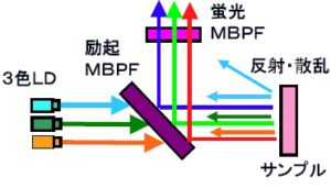 励起フィルタとダイクロイックミラーを1枚のフィルタで実現しています.複数の励起光を使いカラー蛍光画像を観察するシステムに応用できます.リアルタイムでカラー画像を観察するシステムに応用できます.